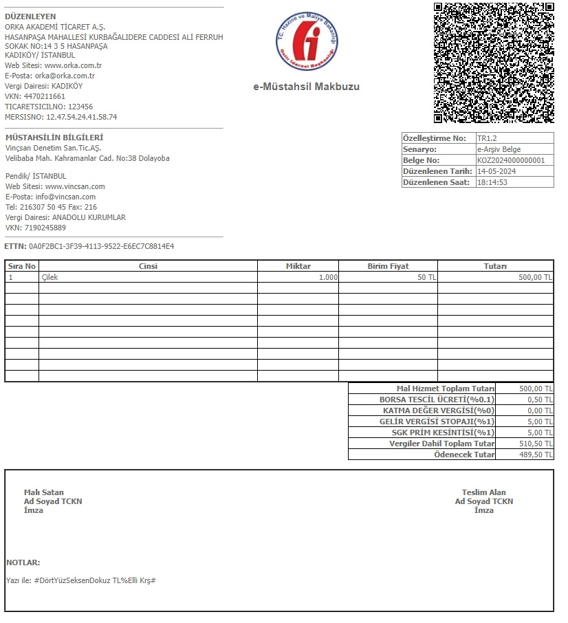 Belgenin düzenlenmesi sırasında alıcı bilgileri, evrak tarihi, ürün detayları, stopaj kesintisi gibi detayları ekleyerek e-müstahsil makbuzunu hazırlayabilirsiniz. Evrakı düzenledikten sonra çıktısı alınarak e-imza yöntemiyle her iki tarafın da belgeyi imzalaması gerekir. İmza ile onaylanmayan E-MM belgesi geçersiz sayılacağını hatırlatmakta fayda var.